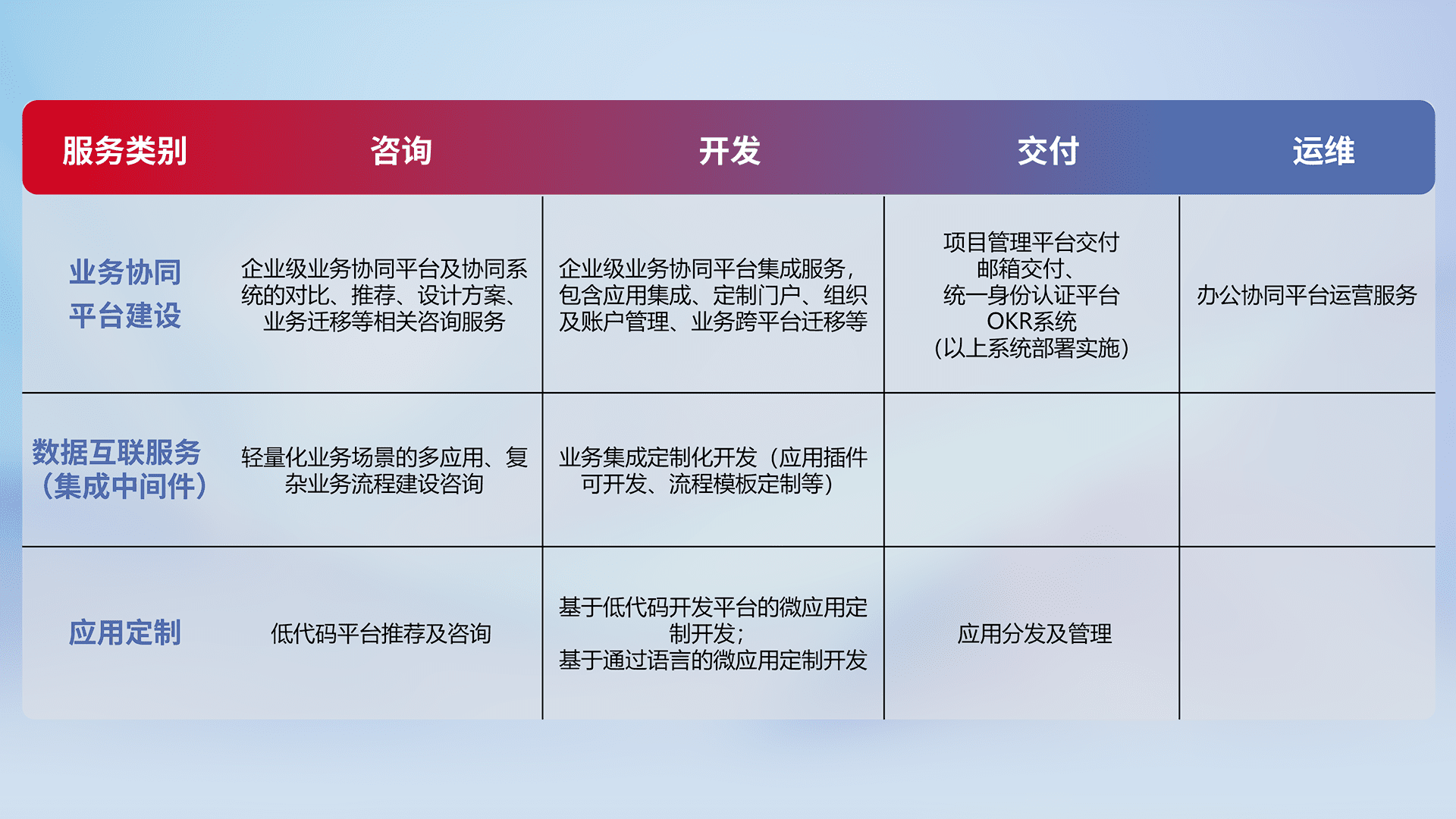 针对钉钉、、、、企微、、、、IDaas等平台级产品提供产品的规划、、、、方案、、、、交付、、、、定制化开发等服务,,,,实现如统一协同办公、、、智能客户服务、、、、混合会议管理、、、智能数据查询、、、等业务场景,,,,实现数字化转型。。。